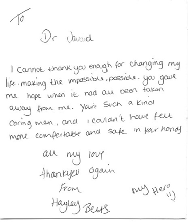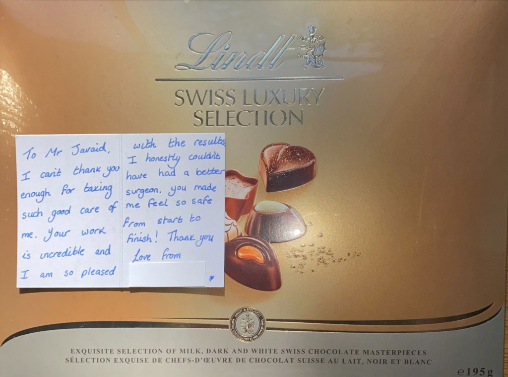 KF: I have been overwhelmed by the care, support & attention from Mr Javaid, and the hospital. Before, during and after surgery, the treatment I have received has been second to none. I can not express my gratitude and appreciation enough!