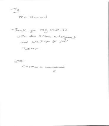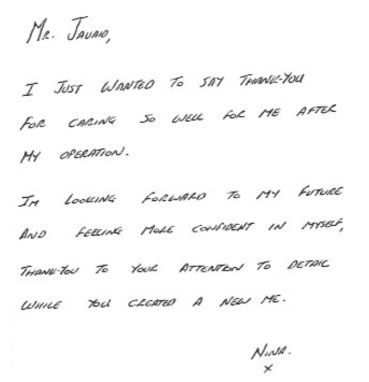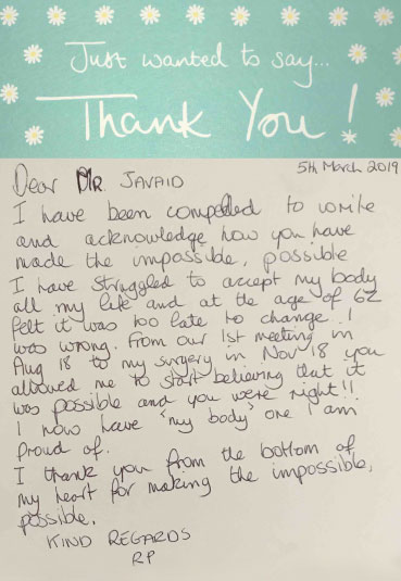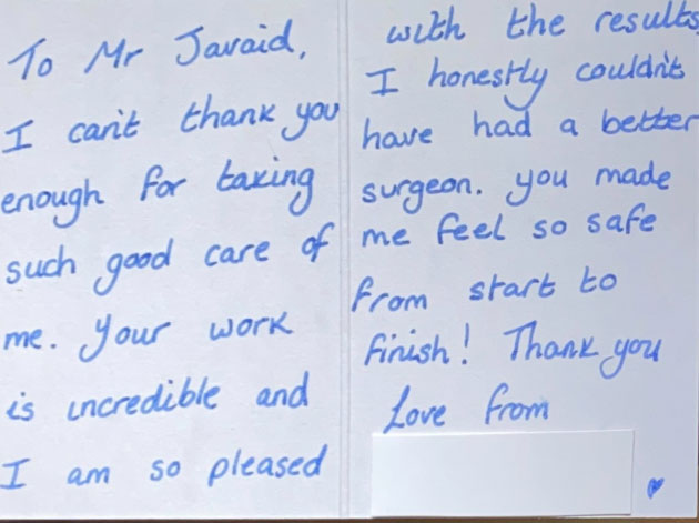 RN: I am extremely happy with the outcome of my surgery. Mr Javaid has a wonderful way of working. Thank you.
