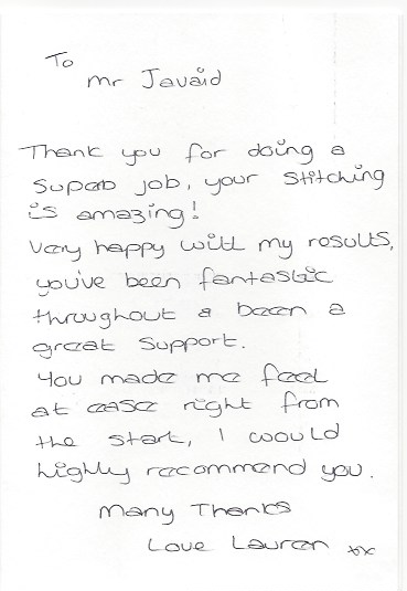 LB: Thank you for doing a superb job, your stitching is amazing! Very Happy with my results, you have been fantastic throughout & been a great support. You made me feel at ease right from the start. I would highly recommend you. Many thanks xx.